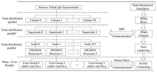 A fluid machine is a type of powerful machine that uses continuously rotating blades as its body to convert energy between working fluids (fluid, gas, liquid or a gas–liquid mixture) and shaft power. Fluid machines can be divided into axial flow, radial flow, mixed flow, and combined flow machines and mainly include vane compressors, blowers, fans, and pumps. They are widely used in the national defense military, aerospace, and national pillar industries, and they play an important role in many national economies [1]. The fluid mechanical simulation algorithm provides a large amount of instructive data for the fluid mechanical design, which can effectively reduce design costs. However, due to the development of high-efficiency, high-precision, and high-expansion parallel algorithms for large-scale fluid machinery, the traditional computing platforms are unable to satisfy the computing requirements of the large-scale fluid mechanical algorithm. The Sunway TaihuLight supercomputer provides a powerful computing performance; its theoretical peak performance reaches 125.44 PFlop/s, and its high-performance linpack benchmark (HPL) performance is 93.01 PFlop/s [2]. However, it is difficult to obtain a good performance on SW26010 processors due to the limited local memory space of each computing processing element (CPE). What is more, normal C/C++ and FORTRAN codes can only use the management processing elements (MPEs) and cannot achieve the best possible performance. Fully utilizing Sunway TaihuLight’s multilevel computing resources, in combination with the system architecture and algorithm, to exploit the parallelism of applications and to fully utilize the powerful computing power of its SW26010 processor is one of the main challenges in efficiently simulating fluid machinery.