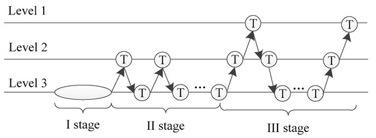 In this paper, a multigrid method, namely, the full multigrid (FMG) method, was used to accelerate the algorithm, which is illustrated in Figure 5. First, the iteration was performed on the coarse grid (Level 3) until the error satisfied convergence criteria, and the iteration process on this layer was completed. Then, the numerical solutions and errors were interpolated to the medium grid (Level 2), where they were iterated via the V-cycle approach, until the convergence criterion was satisfied. Finally, the results were interpolated to the fine grid (Level 1) [27]. This process was iterated, until the convergence of the numerical solution on Level 1 was obtained.