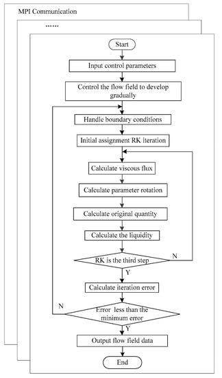 The algorithm flow chart in each node is illustrated in Figure 6. First, the flow field was initialized by reading the input grid file, which specifies the number of grids, the grid coordinates, the grid values, and various physical parameters. Then, the core iteration process of the algorithm, namely, the R-K explicit time marching method, was executed, whose main objective was to solve the equation via iteration, until the results converged. At the same time, multiple nodes were executed in parallel, and the data between nodes communicated through MPI.