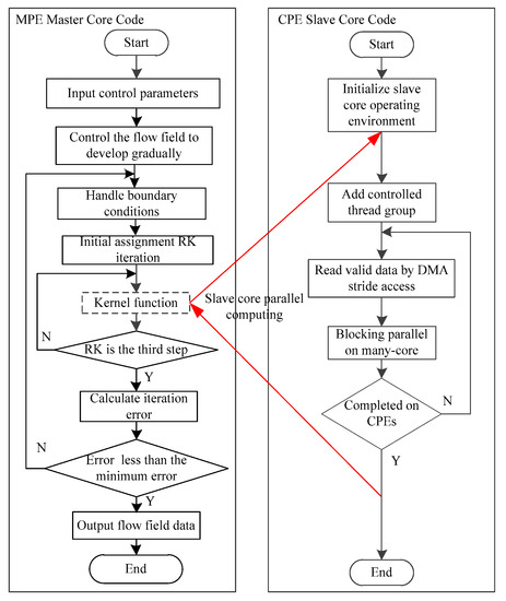 Correspondingly, the swHPFM simulation computing on each CG of SW26010 processor is illustrated in Figure 7. As previously analyzed in this paper, the MPE is responsible for judging and controlling the whole simulation cycle, including calling the file reading module to read the grid data and communicating the boundary data by using the MPI. The CPE is responsible for data parallel computing. Therefore, kernel functions, such as the original quantity, residual, and source term, are distributed to exploit the computing performance.