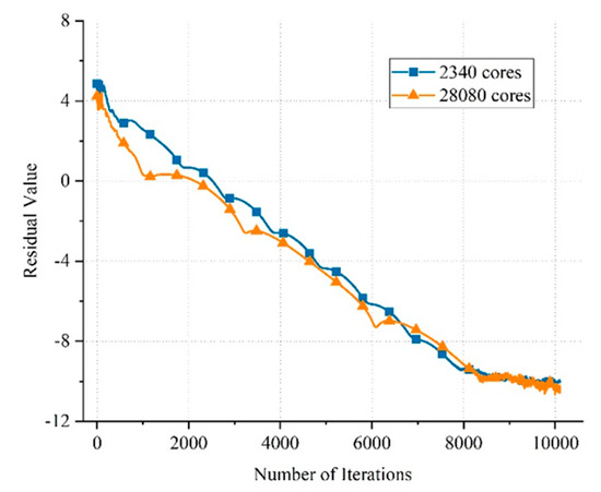 Both the 2340-core-scale and the 28080-core-scale programs of the swHPFM converged at −10, after about 9429 iteration steps, as shown in Figure 11. While the residual convergence curve fluctuated slightly, the residual declined. What is more, these trends are the same as those of the Tianhe-2A supercomputer, whose processors are Intel Xeon E5-2692v2. The residual convergence of hydromechanics corresponds to the accuracy of the swHPFM parallel framework.
