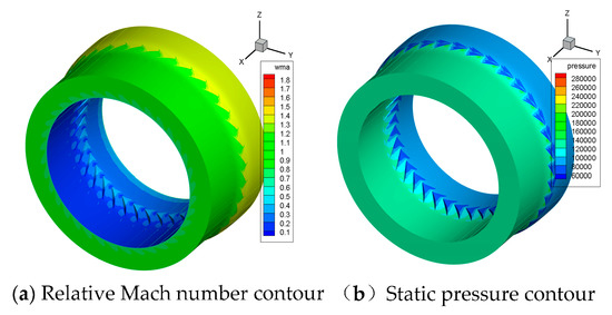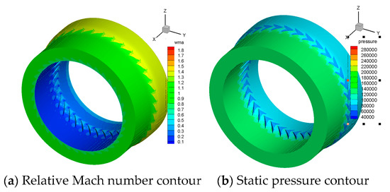 Simulation results with 2340 cores. (a) Relative mach number contour; (b) static pressure contour.