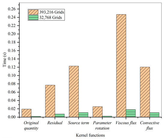 Figure 15a plots the runtimes of the kernel functions, Original quantity, Residual, and Source term, on the Intel and SW26010 processors under the 393,216-grid workload. A common feature of these functions is that they only update inner data and have no data dependence in their instructions. For the Original quantity function, the SAS optimization achieves 5.343× speedup, compared to the unoptimized codes, which can only run on the MPE of the SW26010 processors. On this basis, vectorization optimization obtains 8.362× speedup, compared to the unoptimized code. Finally, the swHPFM is 1.546 times faster than the Intel Xeon E5 processor. For the Residual function, SAS achieves 4.615× speedup, compared to the unoptimized codes. On this basis, after vectorization, a speedup of 7.966× is developed, compared to the unoptimized code. Overall, the swHPFM is 1.154 times faster than the Intel Xeon E5 processor. For the Source term function, SAS obtains a 4.923× speedup. On this basis, vectorization obtains a 8.315× speedup. The swHPFM is 1.342 times faster than the Intel Xeon E5 processor. Since the Original quantity function requires fewer parameters, it achieves a higher speedup.