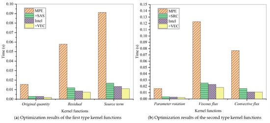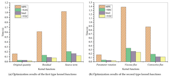 Optimization results of the kernel functions under a 393,216-grid workload: (a) the first type of kernel functions are optimized by SAS+VEC, and (b) the second type of kernel functions are optimized by SRC+VEC.