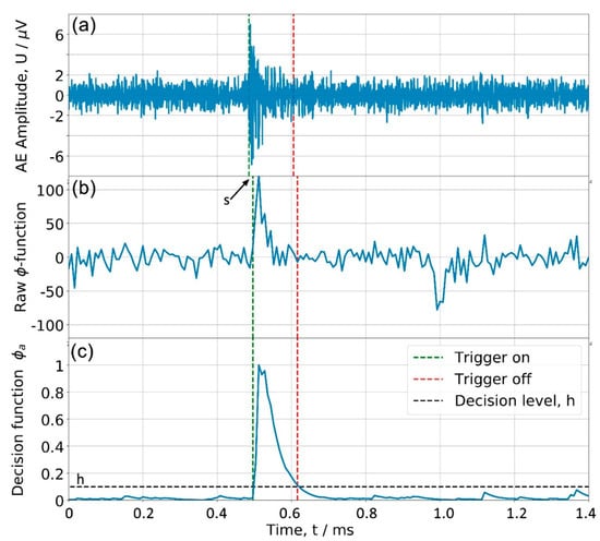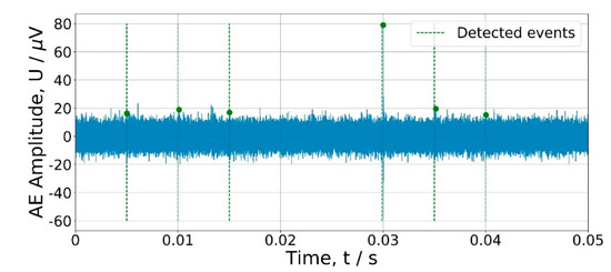 Acoustic emission (AE) has become a widespread method of nondestructive testing, condition monitoring and structural integrity assessment for timely maintenance of dynamic mechanical systems (bearings [1,2,3,4] and gearboxes [5,6,7]) and quasi-statically loaded industrial facilities (pressure vessels [8,9,10], pipelines [11], etc.). In general, AE transient displacements arise at the surface of the solid body in response to rapid structural rearrangements occurring locally during plastic deformation, fracture (including environmentally assisted degradation) or phase transformations. The process of AE generation at the source in structural metals and alloys bears a lot of similarity to that of the earthquakes and is driven by local elastic stress relaxations [12,13]. As damage proceeds, AE appears as a random time series comprising of arbitrarily spaced individual pulses of different amplitudes and shapes, depending on the properties of the source. The amplitude of AE bursts can vary by several orders of magnitude in the dynamic range exceeding 100 dB. Pulses with a high signal-to-noise ratio (SNR) are easily detectable by any of the existing methods. As opposed to this, small amplitude signals are often not resolved from background noise and are therefore lost for any analytics. On the other hand, if the trigger level is set too low, false alarms are recorded due to noise fluctuations. Unidentified false triggering burdens the data analysis and can potentially result in dangerous misinterpretations and wrong decision-making. In fact, the AE sensitivity and the dynamic range are lower and bound by the inevitable background electronic noise that poses the main challenge for low amplitude signal detection. The AE analysis—like the analysis of a seismic time series—starts from signal detection, which is of paramount importance for further processing.