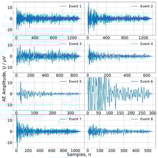 To illustrate the effectiveness of the proposed method in comparison with the conventional amplitude threshold trigger, we constructed two sets of testing signals: the small set of eight equally spaced AE transients and the large one having one thousand AE pulses buried into background noise with random time intervals between the events. To produce these synthetic datasets, we have arbitrarily chosen typical realisations of AE transient waveforms with significantly different amplitudes and durations, which were acquired by the NF-900S-WB (NF Electronics, Yokohama, Japan) wide-band AE sensor during plastic deformation of α-Fe in tension at the sampling rate 2 Msamples/s and 16 bits resolution, as shown in Figure 2.