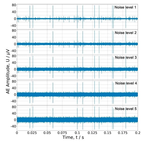 These waveforms were buried into the actual scalable background noise 0.005 s apart from one another, as shown in Figure 3. The noise data represents the actual coloured electronic noise from the pre-amplifier. It was recorded with the same experimental setup, including the sensor connected to the pre-amplifier. SNR values for each of the five chosen noise levels and for each of the eight events are shown in Table 1. For the larger dataset, one thousand waveforms representing a Poisson time series with random independent intervals between each other were embedded into the same noise. Fragments of this dataset with different tested noise levels are shown in Figure 4.