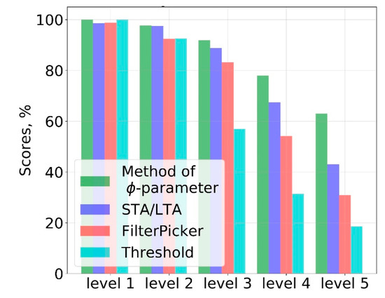 Figure 5 exemplifies the results of signal detection by the φ-algorithm applied to the small dataset with the lowest SNR corresponding to the largest noise level 5 in Figure 3. One can notice that the signals 4 and 5 are missing while the others are correctly detected, yet no false alarms are triggered. Thus, the detection reliability of the φ-triggering method is enhanced compared to other tested methods: the rate of correctly identified events is remarkably higher while the rate of false alarms is consistently smaller than that for other signal detectors at any SNR, including the lowest one as illustrated in the bar chart in Figure 6 comparing the correct detection rates for all tested methods.
