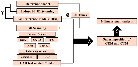 This study was conducted using the following steps: fabrication of a reference model for the production of the CRM and its digitization using an industrial scanner; the digitization of the reference model using intraoral scanners and laboratory scanners for the production of CTM; and the superimposition and 3D analysis of the CRM and CTM using an inspection software (Figure 1).