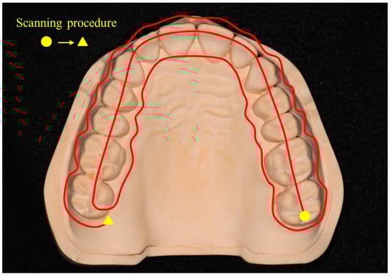 Based on the complete arch scan manufacturer’s instructions and a review of the literature on the accuracy of various scan strategies, the order of scanning was decided (Figure 2) [3]. In accordance with ISO-12836, each scanner was operated at an ambient temperature of 23 ± 2 °C, and the scanning was performed 20 times by one operator (K.S.) skilled in the use of each of the five types of intraoral scanners. In addition, stereolithography (STL) files were extracted for 3D analysis.