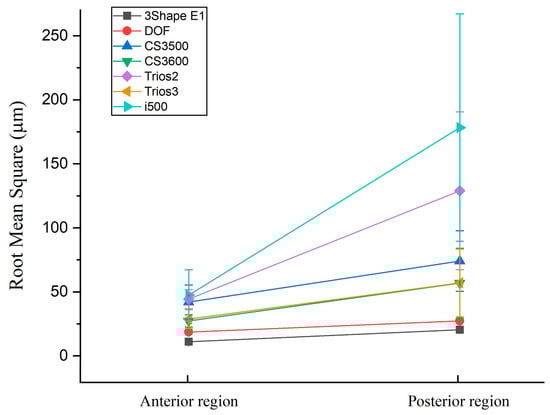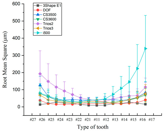 Comparison of the RMS value per tooth (#27~#17) according to the scanner.