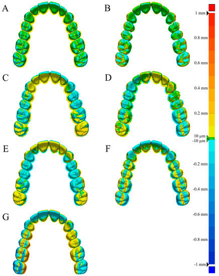 On the color difference map, the range of green zone appeared the most in the laboratory scanners (Figure 6A,B), while the range of green zone was smaller in the intraoral scanners (Figure 6C–H).