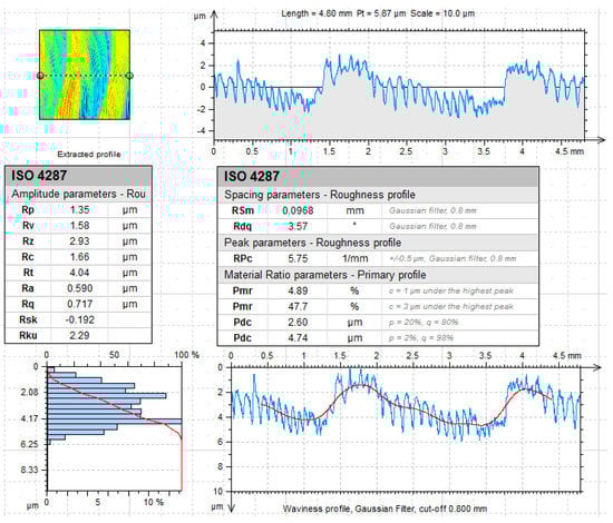 The 3D roughness parameters measurements were based on the following parameters: Sa, Sz, Sku, and Ssk. 2D roughness measurements were carried in five repetitions on each surface, with the use of a Hommel Tester T1000 contact profilometer (Jena, Germany). The following measurement parameters were used for 2D roughness measurements: Traverse length lt = 15 mm and sampling length lr = 2.5 mm, scan rate vt = 0.5 mm/s, and measuring ranges/resolution M = ±320 μm/0.04 μm). T8000 RC120-400 combined roughness and contour measurement system by Hommel–Etamic Jenooptik (Jena, Germany) was the tool for the 3D area roughness profile measurements. The 3D area roughness measurement specifications were the following: lt = 4.8 mm, lr = 0.8 mm, and vt = 0.5 mm/s. The 4.8 × 4.8 mm surface area was scanned in approximately 200 scanning steps. Figure 1 shows an example of a 2D surface profile obtained from the extracted profile analysis, according to the International Standards ISO: ISO 11562, ISO 135651, and ISO 4287.