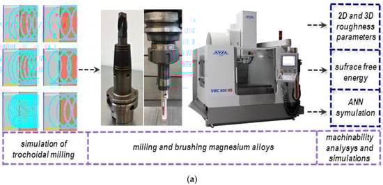 Based on the analyzed literature, it appears that extending the scope of investigations to include a greater number of surface roughness parameters allows a deeper insight into the condition or utilitarian features of surfaces, including, e.g., its fatigue strength characteristics. Therefore, the study reported in this paper employed 2D roughness parameters (Rz, Rku, Rsk, RSm, Ra) and 3D area roughness parameters (Sa, Sz, Sku, Ssk) to describe in detail the surface of AZ91D and AZ31 magnesium alloy substrates after trochoidal milling and brushing. The choice of the workpiece material followed the preliminary search of the literature, which revealed few studies on the machinability of Mg alloys using the trochoidal path and brushing. The influence of vc and str on selected indicators of the surface geometry was assessed based on the results of the surface roughness parameter measurements on the end face and the lateral face of substrates, their surface free energy, and by means of the artificial neural network simulation and statistical tests. The primary purpose of ANN modelling is to forecast the effects of non-linear technological processes, such as trochoidal milling or brushing. Developed further, the methodology may give rise to a decision-making support system to be implemented in manufacturing enterprises.