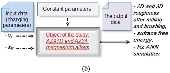The simulation works were carried out with the application of the specialist statistical software, Statistica Neural Networks, and employed two ANN types, MLP (multi-layered perceptron) and RBF (radial basis function). The former model used linear, exponential, logistic, tanh, and sinus activation functions, while for the BFGS gradient (Broyden–Fletcher–Goldfarb–Shanno), the conjugate gradient and the steepest descent training algorithm were used to train the network. The latter network’s activation functions were for hidden neurons, the Gaussian distribution, and for output neurons, the linear function, and it was trained with the RBFT algorithm. The number of neurons in the hidden layer (2–9) and training epochs (150–300) were determined experimentally. The advantages of the selected ANNs are optimal training, validation quality, and error characteristics. The least-squares method was used to identify the network errors. The training data set involved 75% of the experimental data while the remaining 25% were used for validation. Given the insufficient amount of data from milling, it was resolved that the test data set would not be included [].