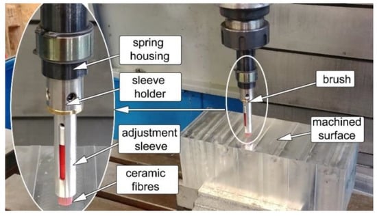 Milling was followed by brushing, which was carried out at constant parameters with a ceramic brush from Xebec (Tokyo, Japan), with a shank diameter of 6 mm. The brush fibers offer different grinding power properties, represented by the pink, red, white, and blue colors. In our tests, red fibers, dedicated for light alloys, were employed. The brushing parameters were constant: n = 5000 rev/min, vf = 300 mm/min, and the distance between the fibers and the work surface, ap = 0.5 mm. Having completed the machining stage, the condition of the surface was evaluated (parameters Ra, Rz, RSm) in order to compare the effects of milling and brushing. Figure 3 shows the brushing treatment in the process.