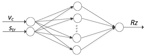 The experimental data were fed into the ANN to simulate the maximum height of the profile (Rz). The milling and brushing processes were approached as the control object and the modelled surface roughness parameter, Rz, became the output parameter. This allowed us to compensate for any inaccuracy issues resulting from the nonlinear character of the simulated processes. The variable parameters of machining were the cutting speed, vc, and the trochoidal step, str (2 neurons in the hidden layer). The ANN schematics in Figure 4 show the analyzed process parameters, the variable input, vc and str, and the output parameters, the surface roughness Rz (one neuron in the output layer). Four different neural networks were prepared to represent the process, including: One machining parameter; two types of machining, milling and brushing; and two workpiece materials, AZ31 and AZ91D. The black box model of ANNs was selected for the performance considerations. This model is suitable whenever mathematical equations fail to accurately describe the process under analysis, as in the studied case.