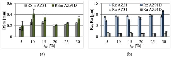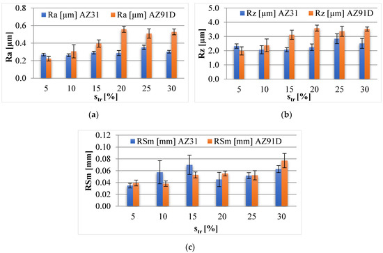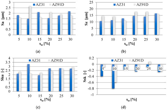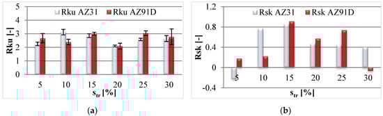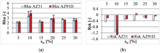 Figure 8 shows the values of Rku and Rsk. In both cases, for most changes in the range of str, the parameters, Rku and Rsk, assume positive values (the exception being the Rsk parameter for alloy AZ31 at str = 5% and alloy AZ91D at str = 30%). Positive values of both parameters may indicate more rounded peaks of micro-irregularities, an increased friction coefficient, and higher corrosion resistance.