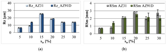 Figure 6a reports the results for RSm, i.e., the mean width of the profile elements. In this case, the increase in the trochoidal step, str, affects the value of RSm. The highest values of this roughness parameter were observed for str = 10% (for AZ31 0.27 mm and AZ91D 0.41 mm, respectively). The results obtained at str 5%, 20%, and 25% were the lowest and thus may be considered as the most favorable from the analyzed viewpoint. Figure 6b shows the results for Ra, which oscillated at approximately 1.5 to 2.0 µm. From the data presented in Figure 6b, it can be seen that increasing the trochoidal step leads to the emergence of different relations depending on the type of workpiece material. In the case of the AZ91D alloy, the surface roughness increases (comparing str = 5% and str = 30%, Rz: from 7.1 to 11.6 µm), whereas in AZ31 alloy, the roughness parameters change only to a slight extent.