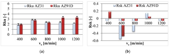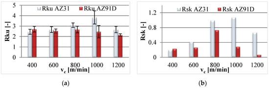 Effect of the cutting speed, vc: (a) Rku and (b) Rsk (str = 15%, fz = 0.15 mm/tooth, ap = 6 mm) measured at the end face of the specimen.