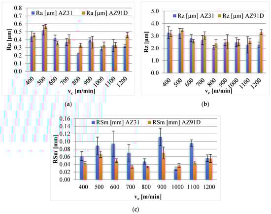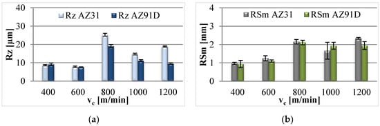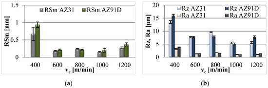 Figure 10a, which shows the recorded values of RSm, gives a clear indication that the increase in the vc value impacts the RSm parameter value. The highest values of RSm were observed for vc = 400 m/min. The results obtained in the 600–1200 m/min range of vc produced the most beneficial conditions of machining, with the lowest RSm. In addition, for vc = 1000 m/min, the RSm parameter values were: 0.115 (AZ31) and 0.2 mm (AZ91D). Figure 10b, on the other hand, shows that the lowest values of Ra were in the region of 1 µm. It can also be seen that as the cutting speed, vc, increases, the Rz surface roughness parameter exhibits a tendency to drop. The lowest values of the Rz parameters are observed in the range of vc = 1000–1200 m/min. This highlights that machining at high cutting speeds (HSM) is beneficial for the condition of the surface. The lowest Rz values were 5.45 µm for the AZ31 alloy and 5.05 µm for the AZ91D alloy (at vc = 1000 m/min). The observed drop in the values of Ra and Rz could be the result of the machining speed entering the range of HSM, in which the cutting forces and the surface roughness are known to decrease.