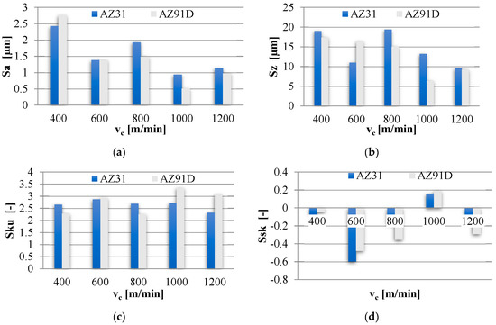 - For both alloys, similar values of the analyzed roughness parameters were achieved (e.g., for vc = 400 m/min, Rz: AZ31 was 8.66 µm and AZ91D was 9.15 µm). The discrepancies could only be considered at the statistical level; however, they are technologically irrelevant.