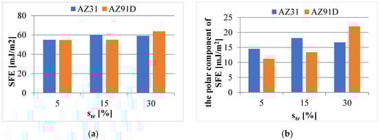 - The largest increase in the value of the surface free energy (16%) was observed for the AZ91D alloy during the change of the str parameter. The increase in the SFE directly impacts the increase in the polar component of the SFE, which for the AZ91D alloy was 96%.
