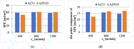 The results from the experiments indicate that the machining parameters affect the surface free energy and its polar component. The largest increase in the value of the SFE was observed for the AZ91D alloy at the str parameter modification. The said increase amounted to 16% when machining with str = 30%, compared to the specimens machined at str = 5%. The maximum increase in the polar component of the SFE was a 96% increase observed in the AZ91D alloy. The cutting speed was similarly found to impact the SFE of the analyzed Mg alloys.