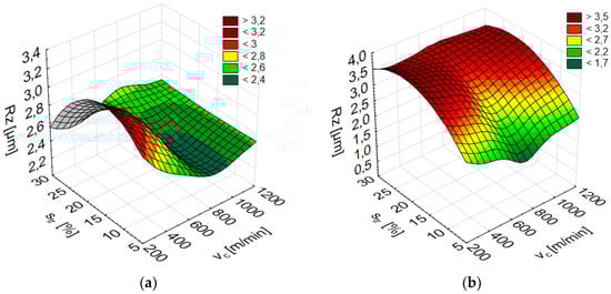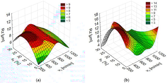 Numerical results of the surface roughness parameters, Rz, after brushing for the (a) AZ31 alloy (RBF 2-8-1) and (b) AZ91D alloy (MLP 2-4-1) depending on the cutting speed, vc, and trochoidal step, str.