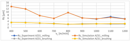 Comparison of the experimental and numerical results of the surface roughness parameters, Rz, depending on the cutting speed, vc, for the trochoidal step, str = 15%, for AZ31 alloy after milling and brushing.