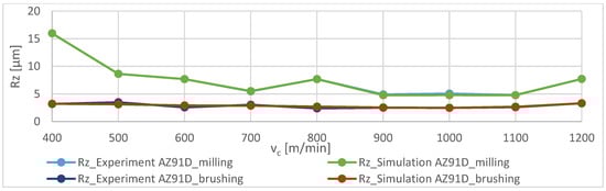 Comparison of the experimental and numerical results of the surface roughness parameters, Rz, depending on the cutting speed, vc, for the trochoidal step, str = 15%, for the AZ91D alloy after milling and brushing.