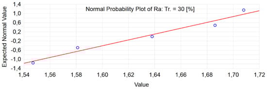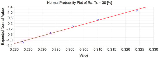 Results from Shapiro–Wilk test of normality conducted for the distribution of the Ra parameter results after trochoidal milling: Ra, AZ31 str = 30%.