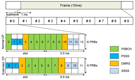 where and represent the scrambling sequences. The subscripts and are directly related with the value of the sidelink identity. The sequence is mapped onto central SSSS subcarriers with indices , yielding the SSSS sequence with sidelink ID j. The arrangement of the PSSS and SSSS sequences differs depending on the CP type. For simple notation, we consider the situation where the first PSSS is transmitted at the l-th symbol, i.e., . According to the CP type, the first SSSS is denoted as
