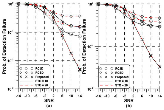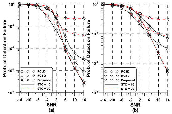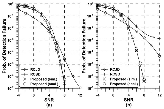Performance of the proposed and conventional detectors in the additive white Gaussian noise (AWGN): (a) (b) .