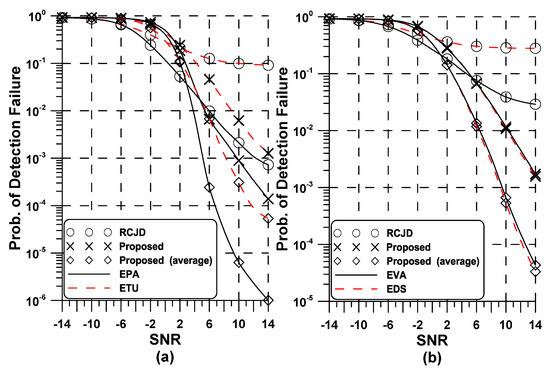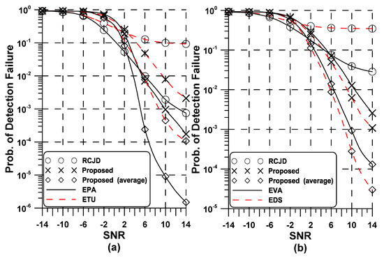 Figure 4 and Figure 5 show the overall probability of failure in jointly detecting IFO, SI, and sidelink ID in the various channel models characterized in Table 1. From the presented results, it can be seen that the detection accuracy of all detection schemes is affected by the amount of the frequency selectivity of the channel. This phenomenon is more pronounced for the conventional detection schemes, which is explained by the fact that the existing detection methods exploit the differential correlation under the assumption . This approximation proves to be valid for weakly frequency-selective channels as AWGN and EPA models, but is less appropriate for high frequency-selective channels as ETU and EDS. As reported in [34,35], a typical SNR of LTE signal is around 5 dB in most cell areas and over 20 dB SNR is achieved in the cell center, while a low SNR of 0 dB or below can be observed near the cell edge. When there is frequency selectivity and residual STO, the performance of the proposed sequential method is still superior to that of the conventional method since the SSSS detection can be performed only after the PSSS being successfully identified. Specifically, the SNR regions of which the proposed scheme shows better performance are above 5 dB and 1 dB in the EPA and EDS channel models, respectively. Another interesting observation from Figure 5 is that a performance degradation in the proposed scheme occurs due to the high Doppler frequency especially in the ETU channel, however the impact of Doppler frequency on its detection performance is not critical. Since the frequency selectivity and STO are inevitable in D2D applications, it is concluded that the proposed detection scheme achieves good overall detection performance in a typical LTE SNR range with the complexity not higher than existing detection methods.