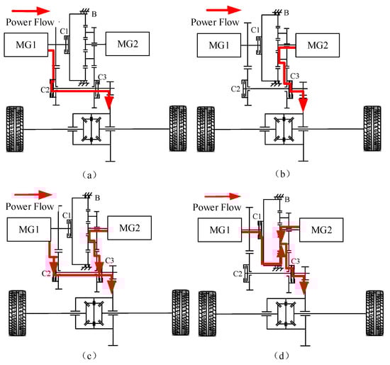 The power flow of different working modes. (a) MG1 drive alone; (b) MG2 drive alone; (c) Torque coupling drive; (d) Speed coupling drive.