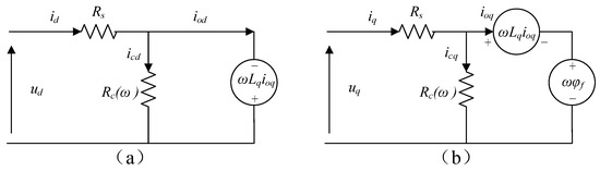 There is always power loss in the working process of a motor, which leads to the fluctuation of speed and torque. The iron loss model can not only reflect the changes of motor voltage, current, flux, and torque, but can also express the changes of the controllable loss including copper loss and iron loss caused by the winding current, which is widely used in the PMSM loss modeling [17]. The equivalent circuit diagram of the PMSM dynamic model employed in this paper is shown in Figure 3. Considering the loss caused by the stator eddy current and hysteresis effect, an iron loss resistance is added to the equivalent circuit in parallel.