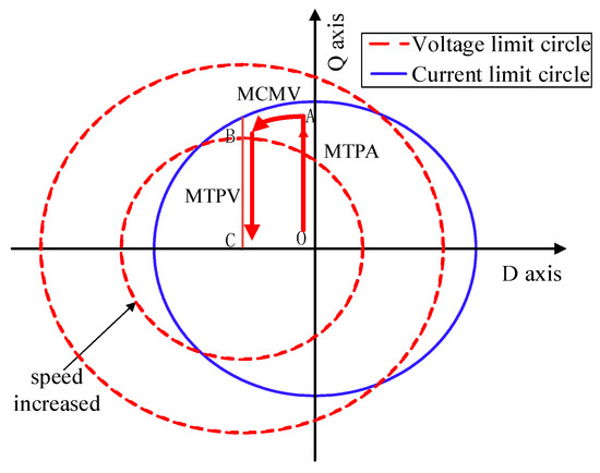 To sum up, the running trajectories of the boundaries of the three control strategies in the d-q coordinate system are shown in Figure 4. OA, AB, and BC represent the running trajectories of the three control strategies (MTPA, MCMV, and MTPV) in the d-q coordinate system, respectively.