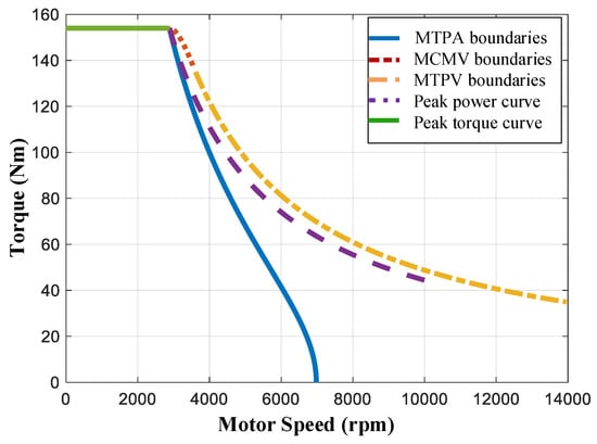 To analyze the influence of different current control strategies on the motor speed–torque characteristics, the external characteristics under different strategies are obtained, as shown in Figure 5.