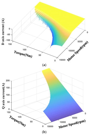 Based on the designed current control boundary curve, the speed and torque are traversed and substituted into Equations (8) and (9) to obtain the current of the d axis and q axis of all the work points. The resulting speed–torque–current map of the d-axis and q-axis are shown in Figure 7.