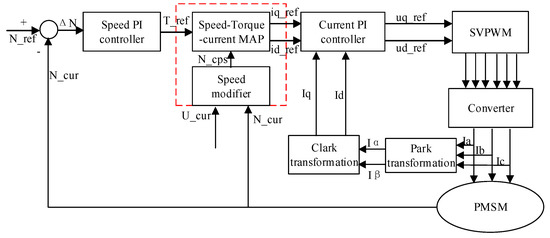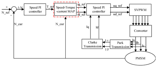 In order to solve the nonlinear problem of the PMSM current in the weak magnetic region, a vector control strategy is designed for the motor based on the speed–torque–current map, as shown in Figure 8. When the motor runs in the weak magnetic region, the d and q-axis currents are obtained using the lookup table method. This method avoids the control problems caused by the nonlinear current, which in turn extends the weak magnetic working region of the motor. It is convenient to obtain the current in the deep weak magnetic region by using the lookup table. Besides, the following problems can also be solved: it is difficult to obtain the current simply by using the weak magnetic PI controller, and the dynamic response of the motor is slow.