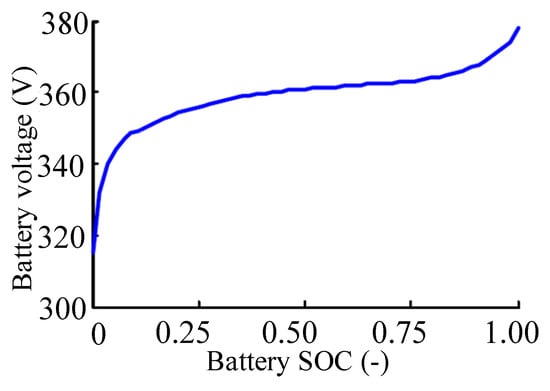 Charging and discharging are always present in the driving process of pure electric vehicles, which leads to the change of battery SOC (state of charge). The relationship between the battery voltage and SOC is shown in Figure 9. The change of the battery voltage causes the dynamic change of bus voltage amplitude [25], which in turn affects the d-axis current and q-axis current, as well as the speed and torque characteristics of the motor.