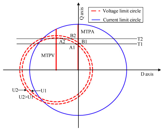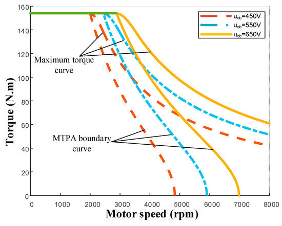 It is shown in Figure 10 that when the bus voltage decreases, the control boundary and the maximum torque boundary of the motor move to the left, which reduces the motor working range. If the influence of bus voltage variation is ignored, the operation of these areas cannot be controlled. When the voltage increases, the bus voltage cannot be fully utilized. When the voltage decreases, the working point may be outside the allowable motor working range, which leads to the over-current or over-voltage protection. The influence of bus current on the motor can also be seen from the perspective of current control of d and q axes, which is shown in Figure 11. When the bus voltage is , the motor works at points and to realize torques and , respectively. If the bus voltage increases from to , then the motor working points are and , which improves the utilization ratio of the bus voltage. On the contrary, if and are the required torques, the motor works at points and . If the bus voltage decreases from to and the control strategy still takes and as working points. In this situation, the current regulator saturates and loses its ability to regulate the current.