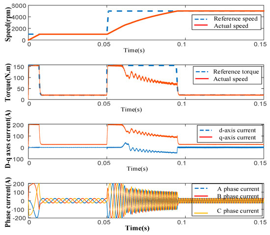 To validate the control effect of the proposed vector control strategy, a working condition is designed in which the bus voltage and load torque are 650 V and 20 Nm, respectively. Besides, the motor speed first accelerates from 0 to 1000 rpm, and then again accelerates from 1000 to 5000 rpm after the speed stabilizes for a short period (around 100 ms). The simulation results are shown in Figure 13 and Figure 14.