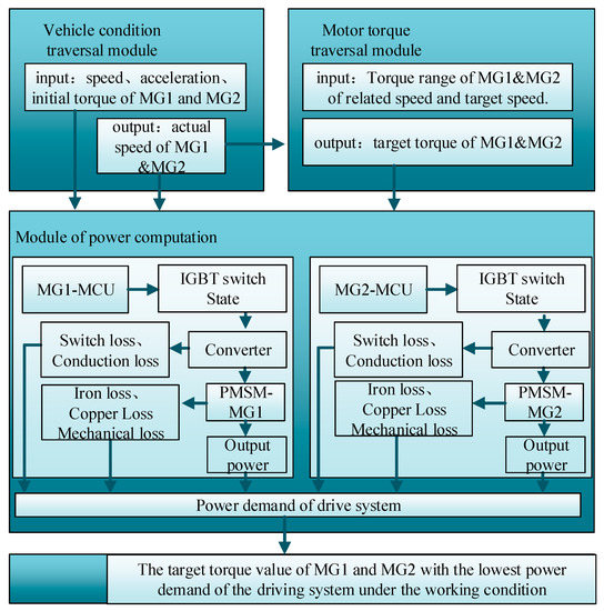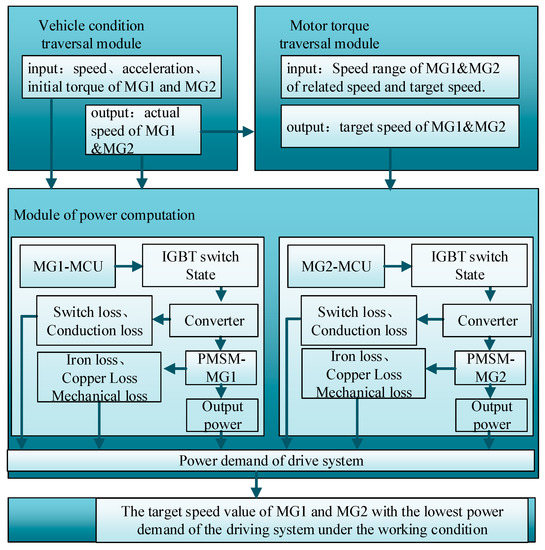Table 5 shows that the power of MG1 increases and that of MG2 decreases, with the increase of the MG1 target speed n1*. When the optimal speed (3590 rpm) obtained by the static model is taken as the target speed of MG1, the average demand power of the drive system is 23.543 kW, which is not the minimum demand power of the electric drive system under this condition. When the MG1 target speed n1* is 5600 rpm, the maximum power demand of the electric drive system is 28.595 kW. This is because when the target speed of MG1 is 5600 rpm, the speeds of motor MG1 and MG2 need to be adjusted from 3242 rpm to 5600 rpm, and from 733 rpm to −4165 rpm, respectively. This is a large speed regulation process, which leads to power loss. When the target speed of MG1 is 1867 rpm, the minimum demand power of the electric drive system can be obtained, i.e., 22.092 kW. This minimum value is 6.16% lower than the average demand power obtained from the static model and 22.74% lower than the maximum demand power of the electric drive system.