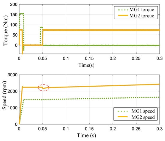 The target speed of MG1 is taken as an example to analyze the speed–torque characteristics during the working point transfer process. The dynamic responses of MG1 and MG2 are shown in Figure 20.