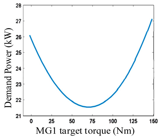 In the torque coupling mode, the torques of MG1 and MG2 can be coupled arbitrarily, as long as the output torque of the vehicle meets requirements. This means that countless combinations of the torques of MG1 and MG2 exist. The economy of each combination can be measured by the demand power of the electric drive system. According to the flow shown in Figure 16, the MG1 target torque is traversed to obtain the corresponding demand power of the electric drive, as shown in Figure 19.