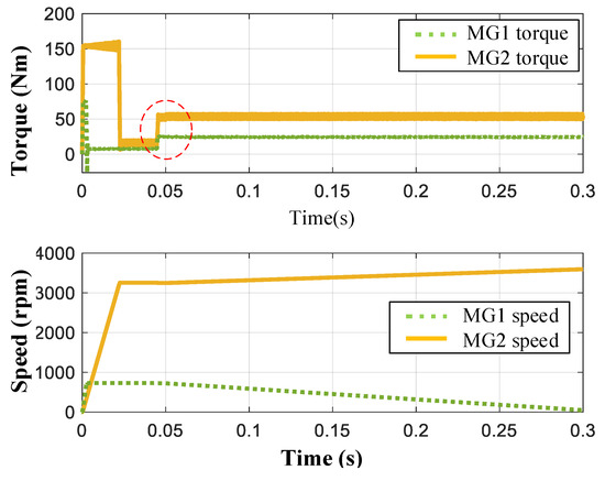 As shown in Figure 20, in the period of 0–0.045 s, the speed of the two motors are adjusted to the speed when the vehicle speed is 60 km/h. In the period of 0.045–0.05 s, the torques of the two motors are adjusted to the demand torque corresponding to the condition (i.e., 60 km/h speed and 0.48 m/s2 acceleration). At the moment of 0.05 s, the MG1 speed is adjusted to the target speed of 3590 rpm; meanwhile, the torque of MG1 increases and that of MG2 decreases as these two motors need extra torque to overcome the rotational inertia force when the speed changes.