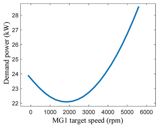 According to the power distribution flow in Figure 16, all of the energy consumption corresponding to the target speed n1* of MG1 can be obtained. When the vehicle speed is 60.43 km/h, the range of n1* is [−295 rpm, 5600 rpm]. When the initial speed of MG1 is set to 3242 rpm, the target speed of MG1 traverses in the interval of [−295 rpm, 5600 rpm] to obtain the demand power of the electric drive system. The demand power of the system, corresponding to different target speeds of MG1, is shown in Figure 21.