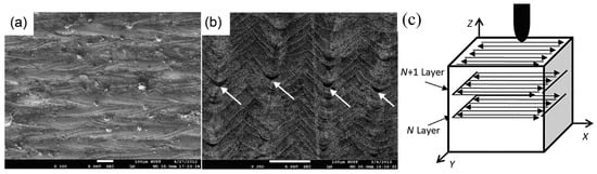 The surface morphology of LPBF parts is related to the laser scanning process. In the work conducted by Li et al. [], the surface of the as-built IN625 sample presented a typical “V” shape morphology (Figure 2a), which is similar to the situation in the welding process. However, the shape of the Y–Z section is “scales” as shown in Figure 2b. The width of the melt track is about 100 μm, and the adjacent tracks overlap closely, resulting in nearly 100% density and almost no gaps. The “V” angle increases as the laser scanning speed decreases.